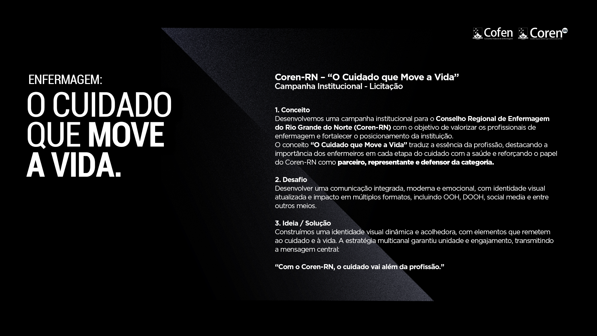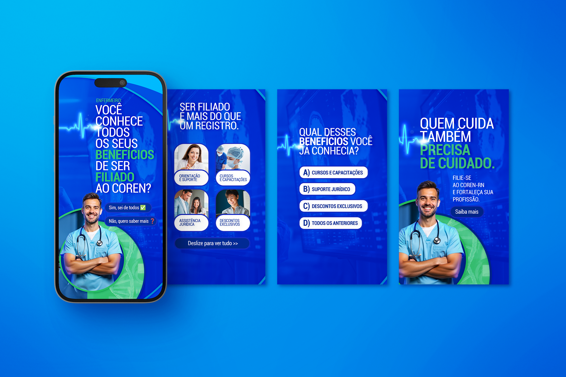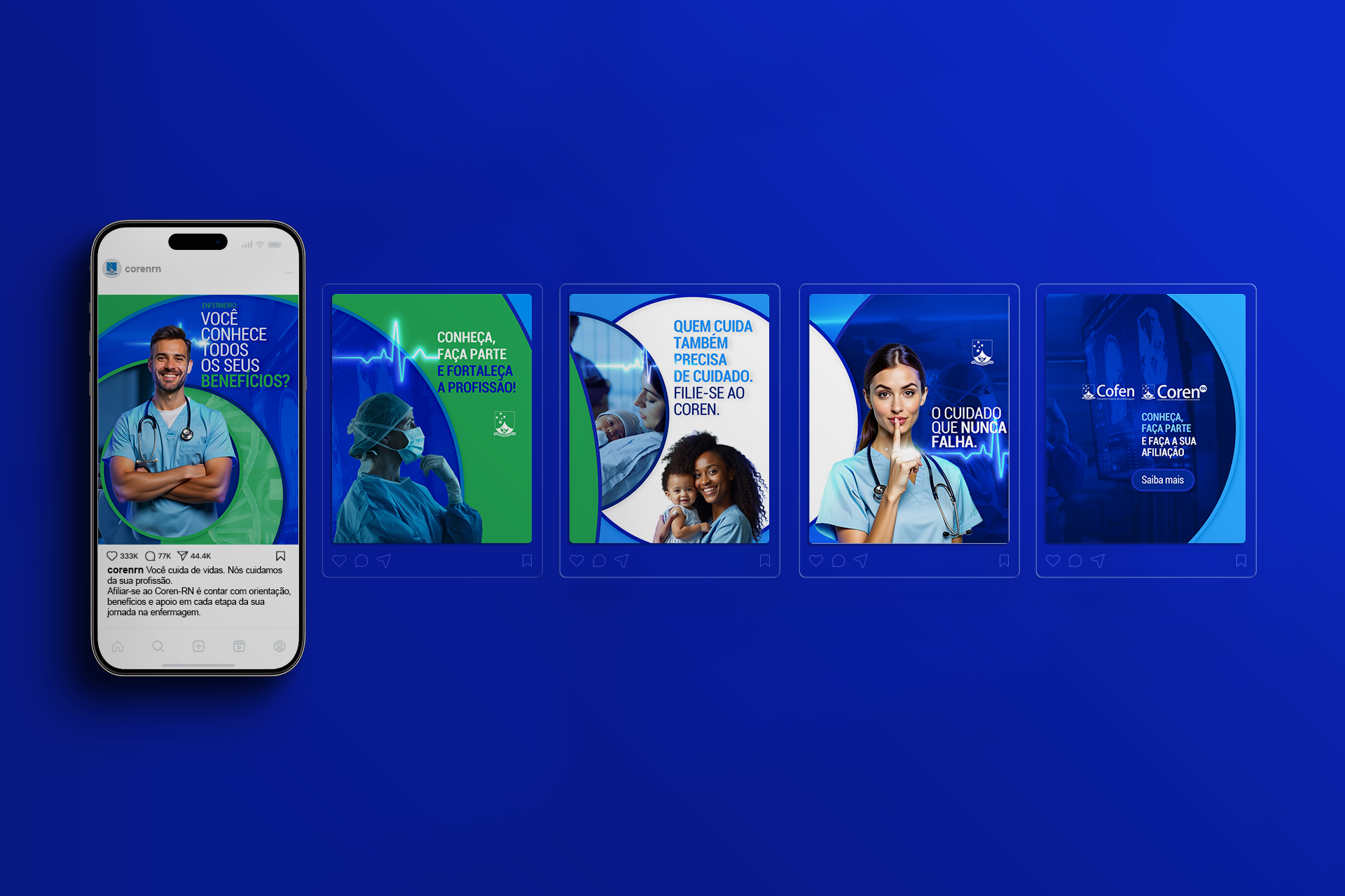 Campanha institucional do Conselho Regional de Enfermagem do Rio Grande do Norte (Coren-RN), que valoriza os profissionais de enfermagem e reforça a importância da instituição no fortalecimento da profissão. Por meio de peças digitais e experiências interativas, mostramos como o cuidado dos enfermeiros impacta vidas todos os dias.