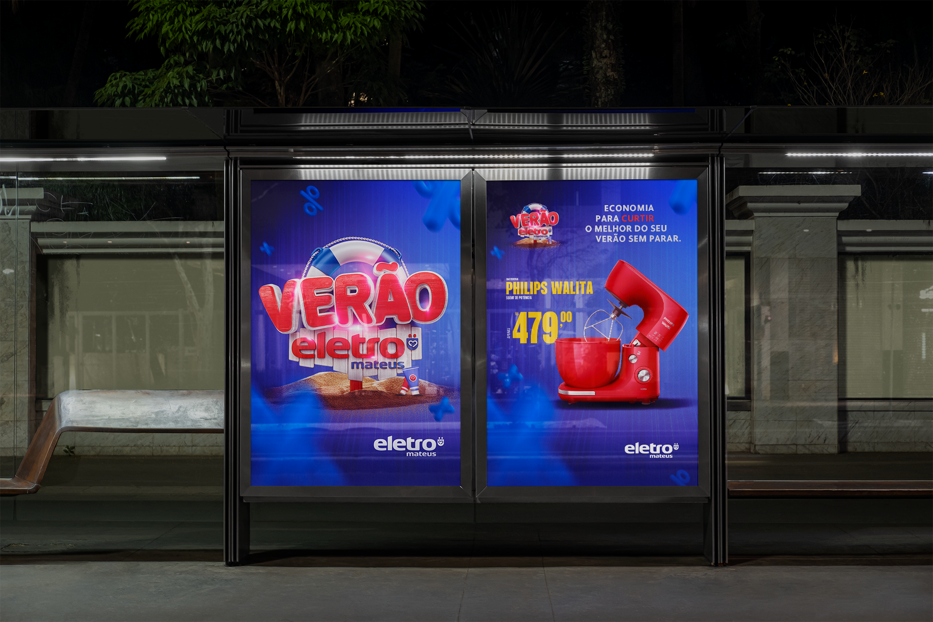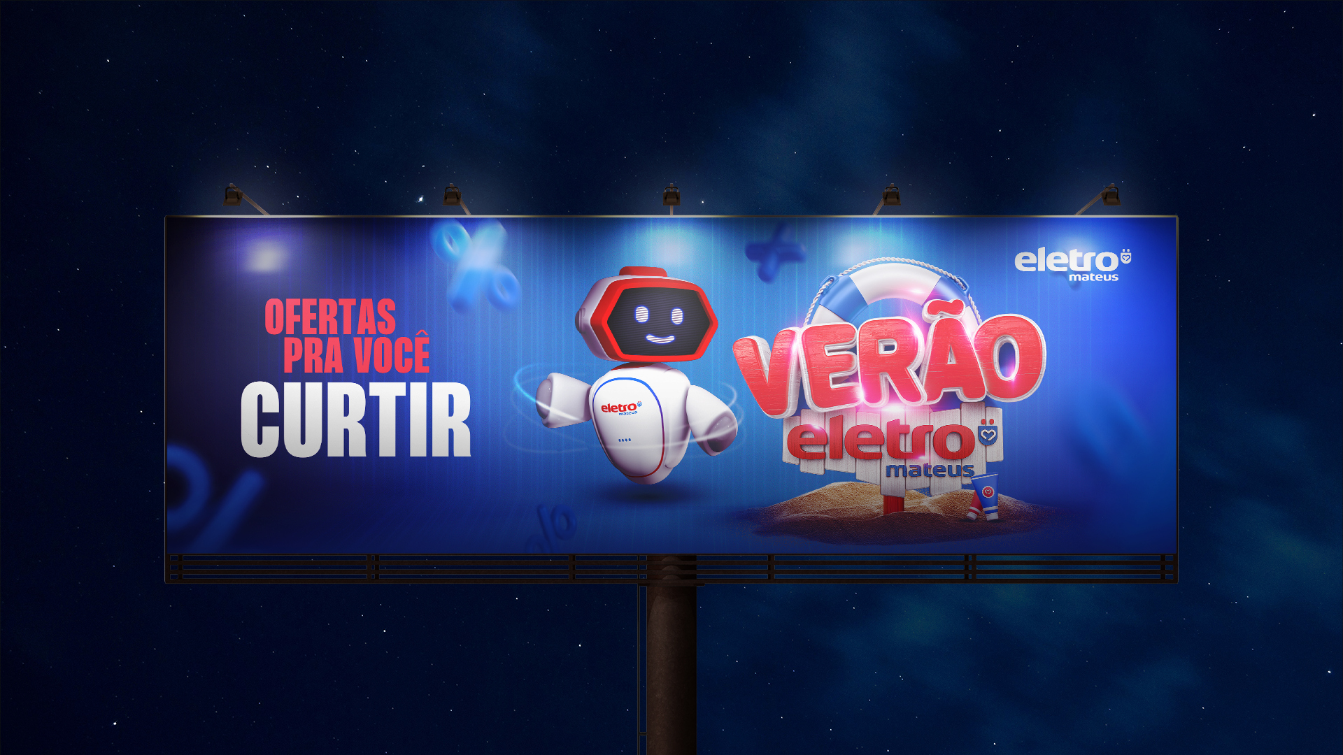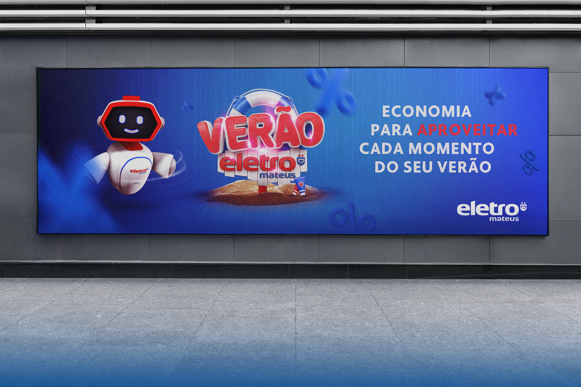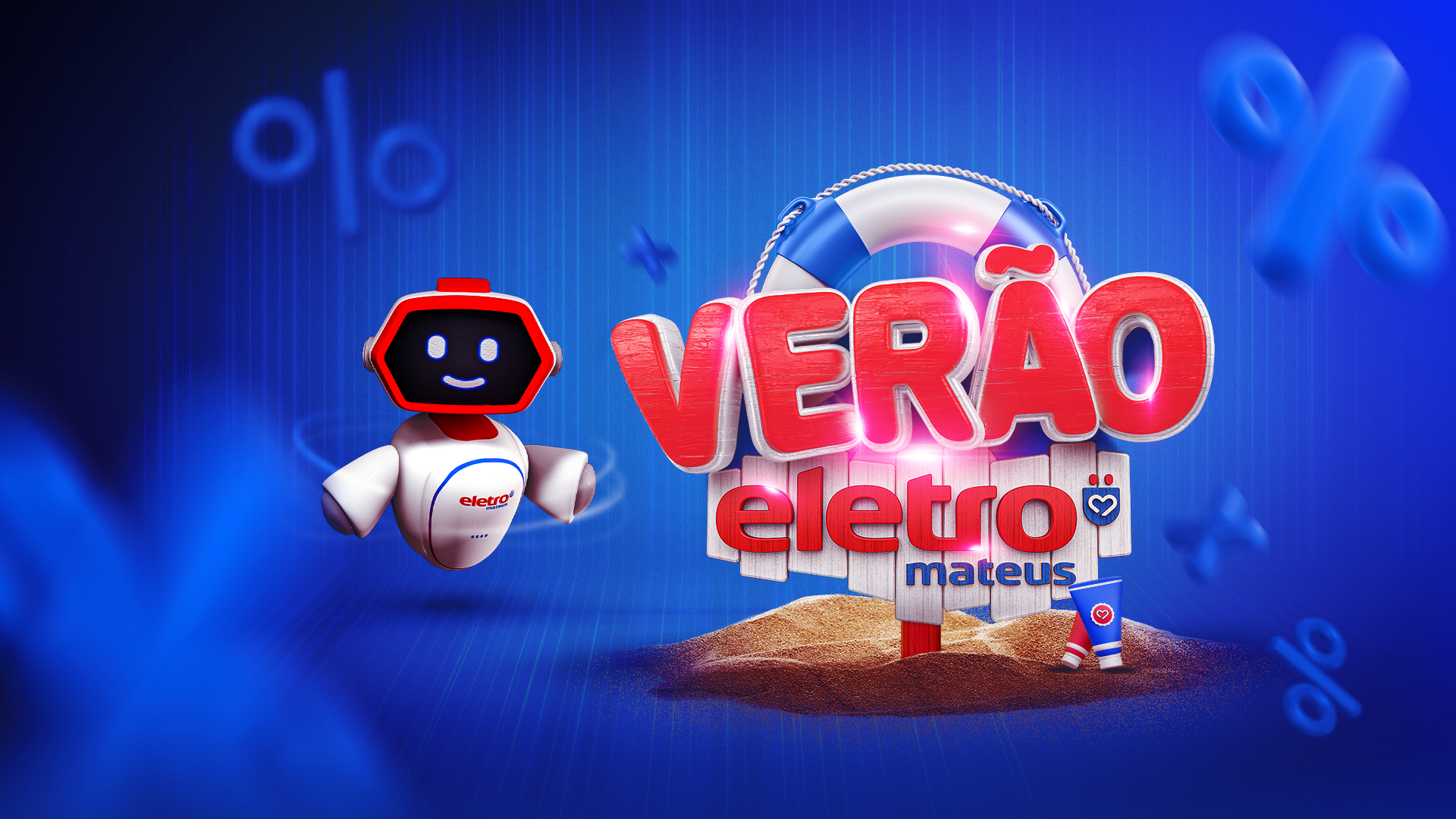 Verão Eletro Mateus Campanha criada para celebrar a estação mais vibrante do ano, unindo economia e diversão. O key visual traz elementos praianos e linguagem 3D para reforçar a leveza do verão, ao mesmo tempo em que comunica de forma clara as ofertas da marca. O resultado é uma identidade visual que conecta emoção e benefício, convidando o público a aproveitar cada momento da temporada com a Eletro Mateus.