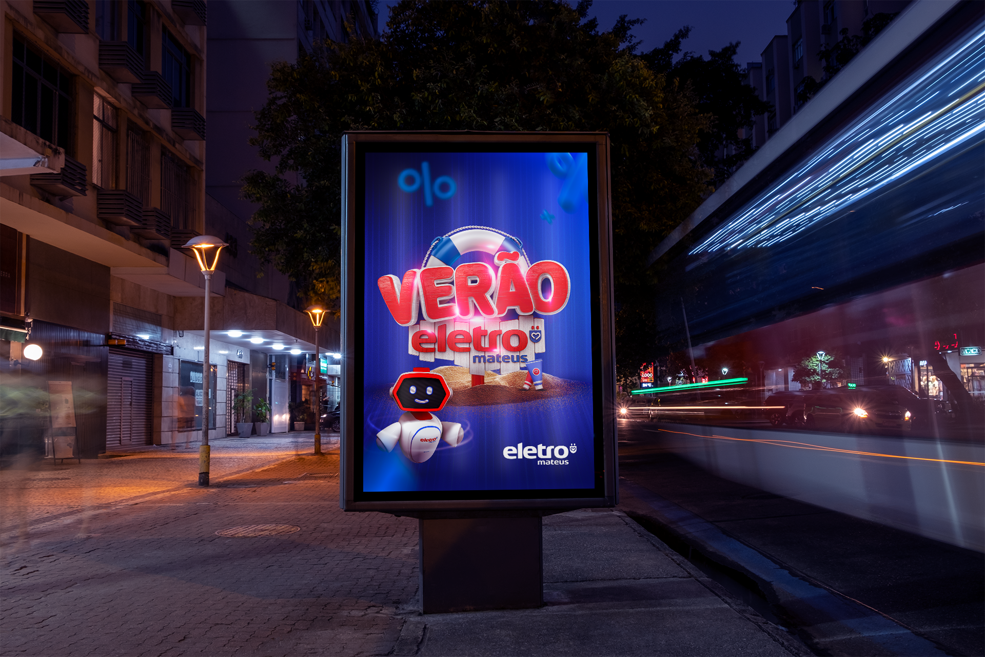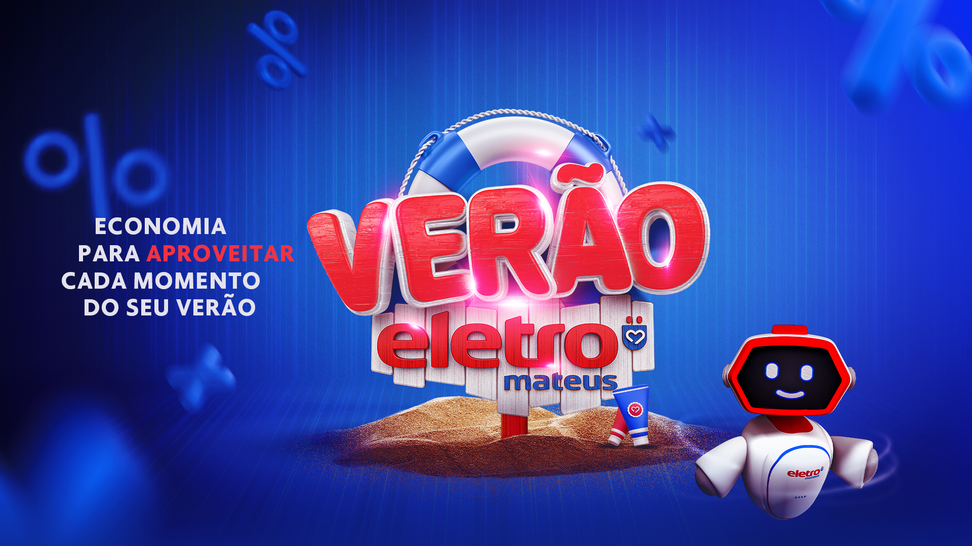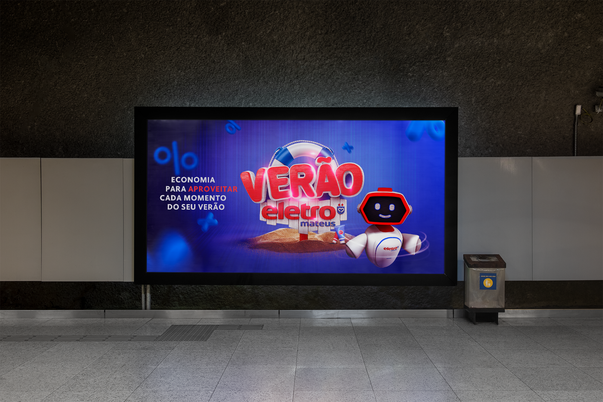 Verão Eletro Mateus Campanha criada para celebrar a estação mais vibrante do ano, unindo economia e diversão. O key visual traz elementos praianos e linguagem 3D para reforçar a leveza do verão, ao mesmo tempo em que comunica de forma clara as ofertas da marca. O resultado é uma identidade visual que conecta emoção e benefício, convidando o público a aproveitar cada momento da temporada com a Eletro Mateus.