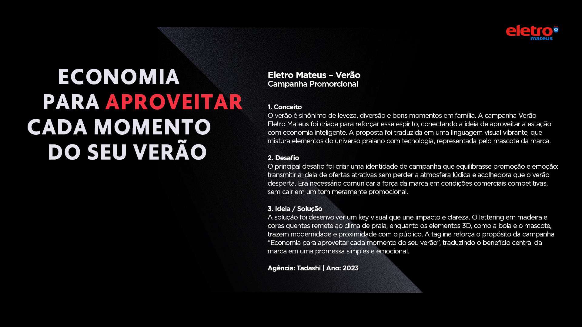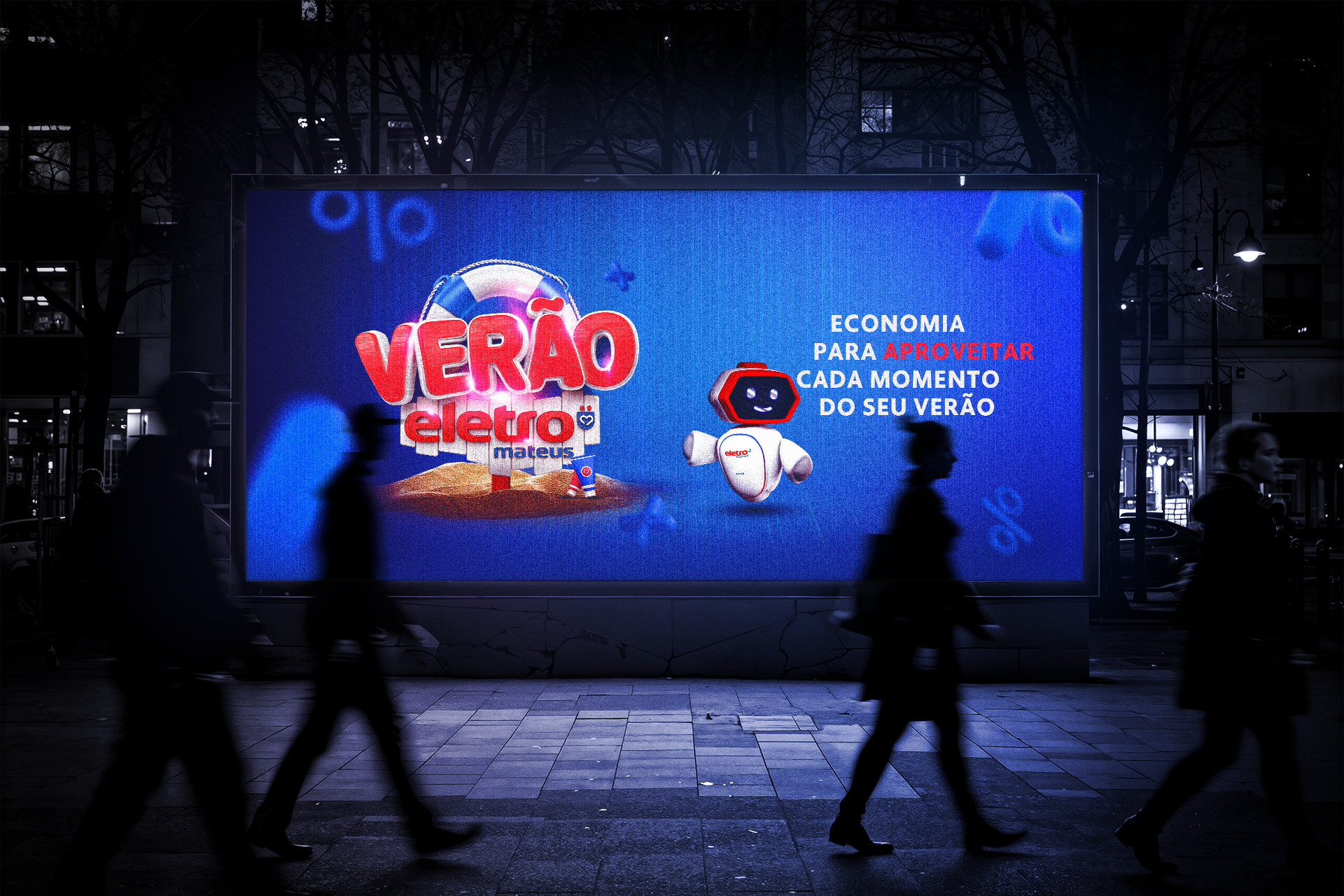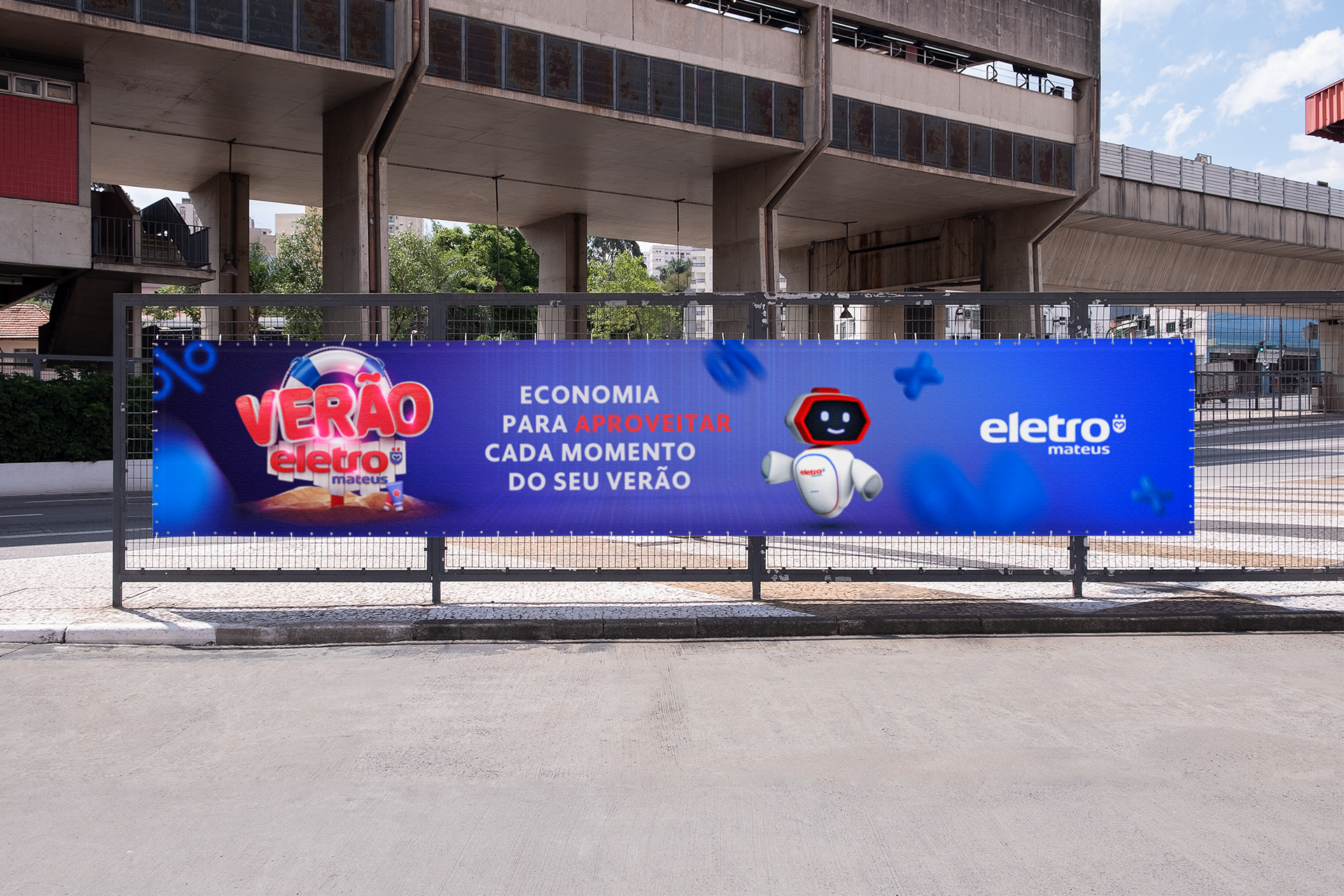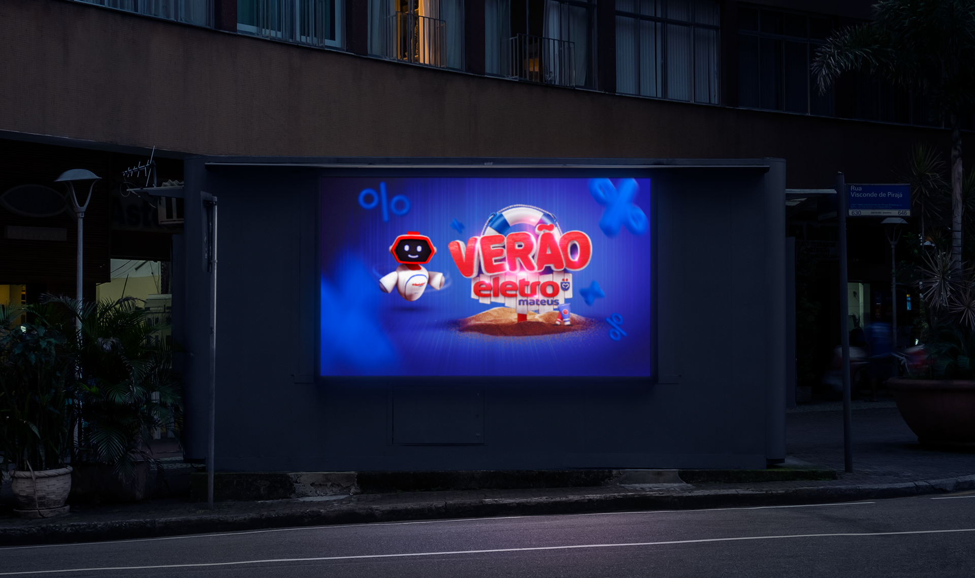 Verão Eletro Mateus Campanha criada para celebrar a estação mais vibrante do ano, unindo economia e diversão. O key visual traz elementos praianos e linguagem 3D para reforçar a leveza do verão, ao mesmo tempo em que comunica de forma clara as ofertas da marca. O resultado é uma identidade visual que conecta emoção e benefício, convidando o público a aproveitar cada momento da temporada com a Eletro Mateus.