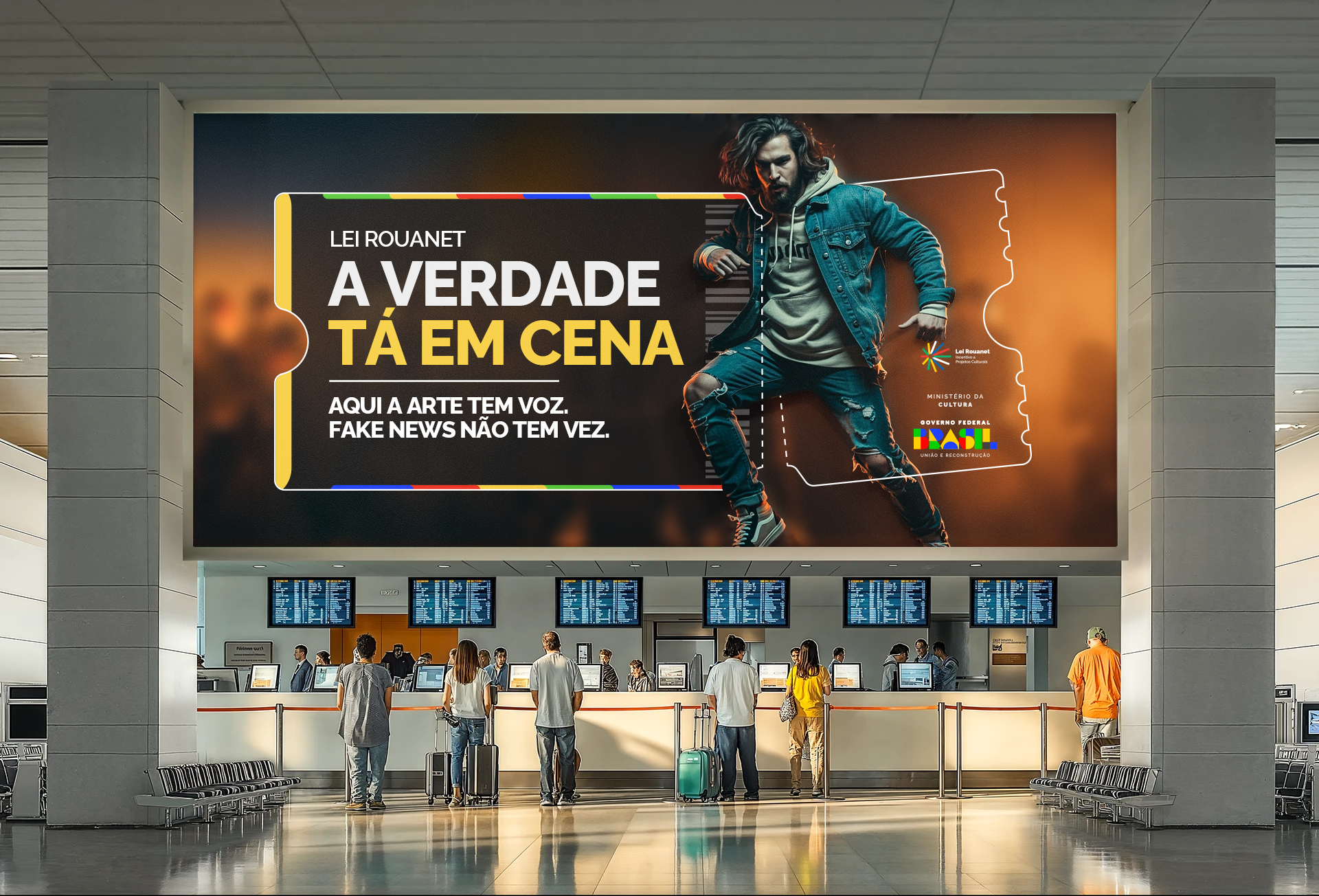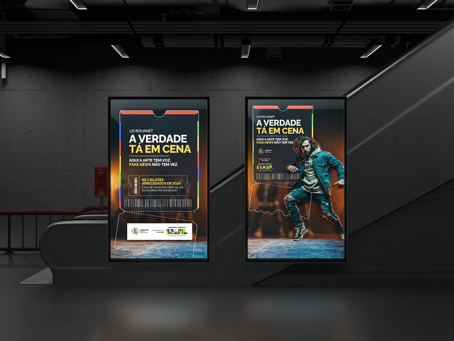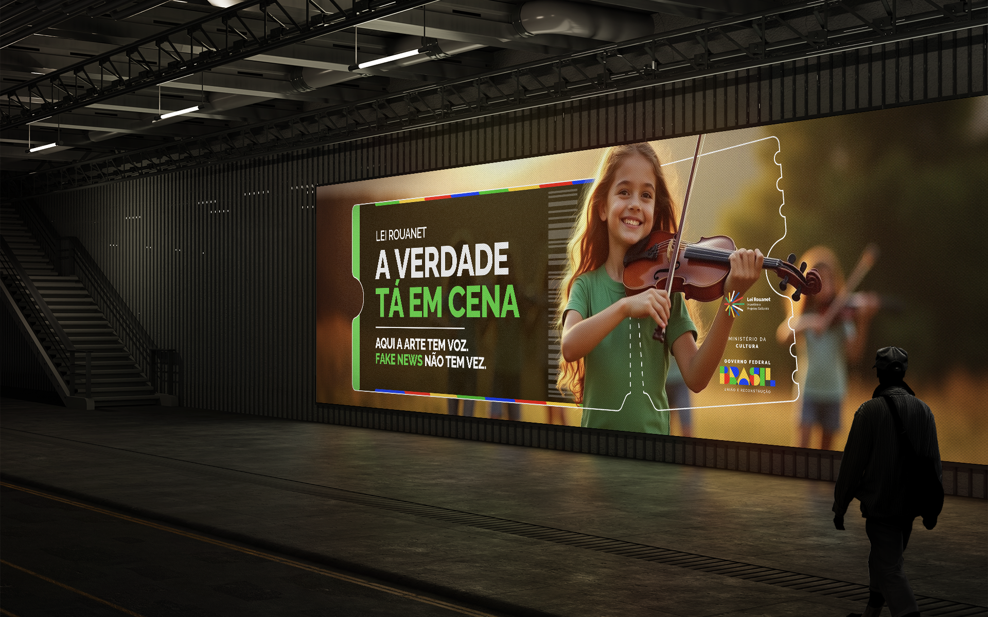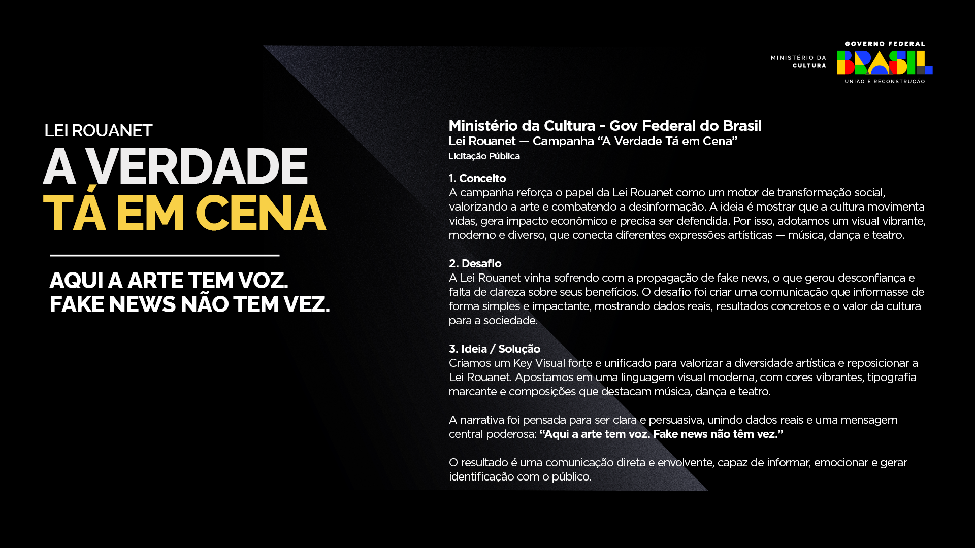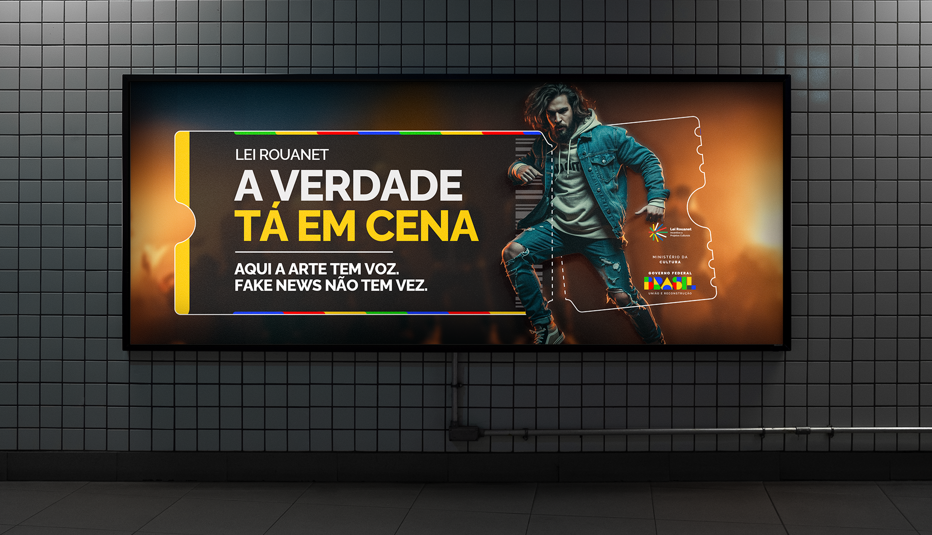 Ministério da Cultura — Governo Federal Brasil | Lei Rouanet — “A Verdade Tá em Cena” A campanha mostra o poder da arte e o impacto real da Lei Rouanet na sociedade, combatendo desinformação e fake news. Criamos um Key Visual forte e unificado, com cores vibrantes, tipografia marcante e composições que conectam música, dança e teatro, celebrando a diversidade artística brasileira. A narrativa combina dados reais com uma mensagem central: “Aqui a arte tem voz. Fake news não têm vez.” O resultado é uma comunicação clara, envolvente e visualmente impactante, que informa, emociona e reconecta o público com a importância da cultura no Brasil.