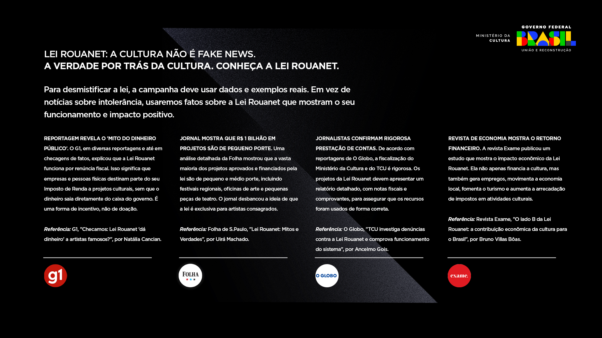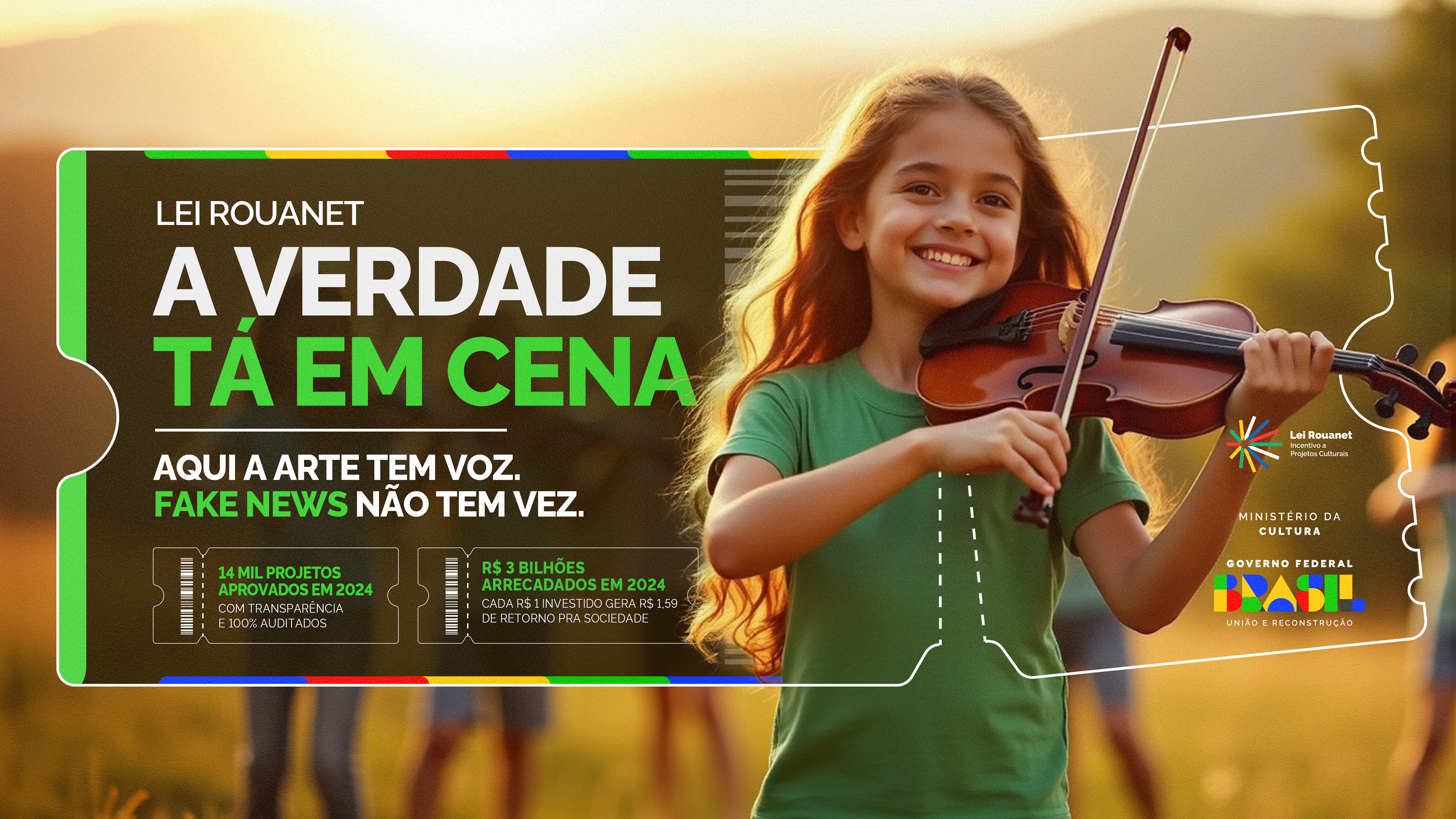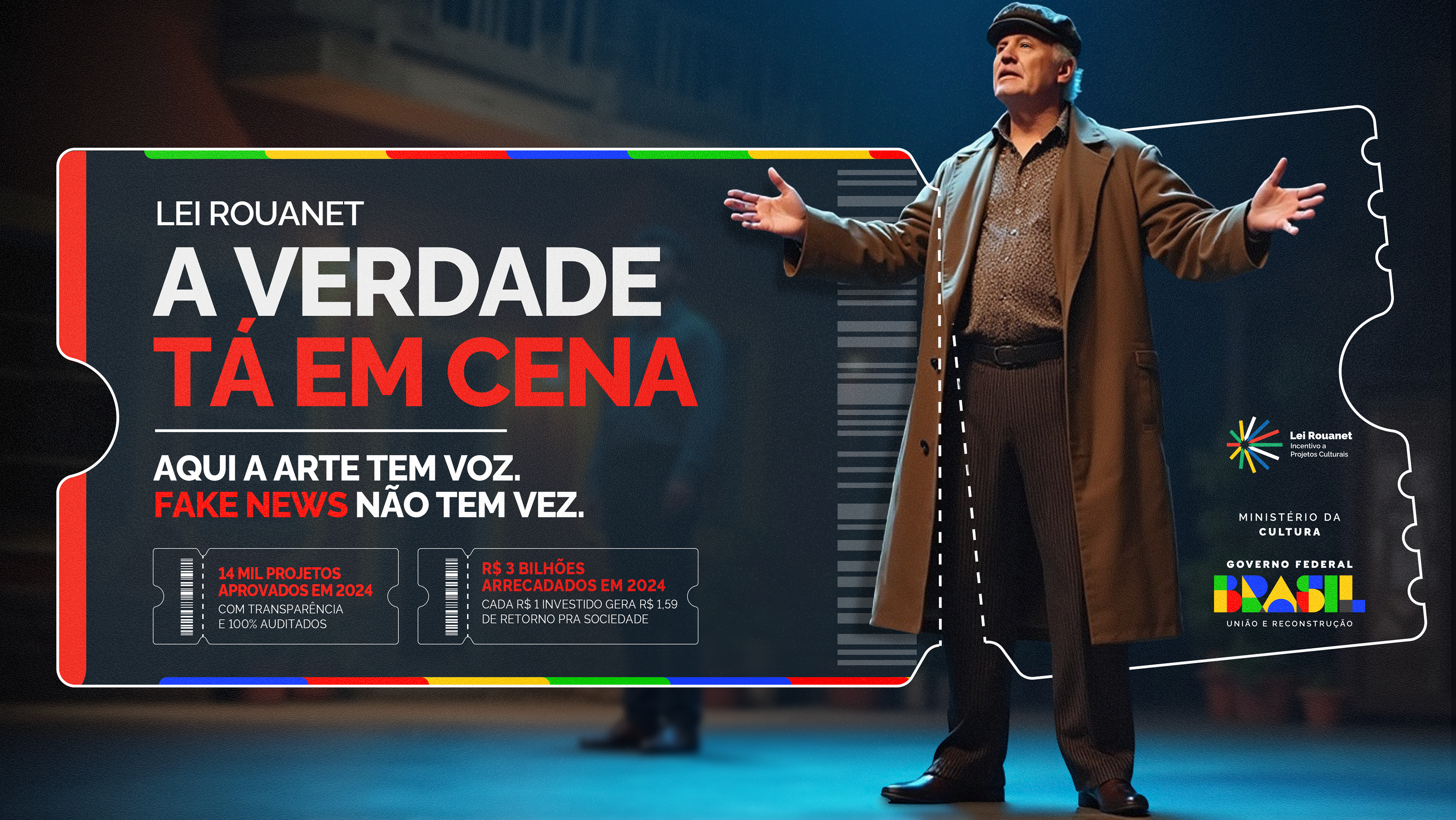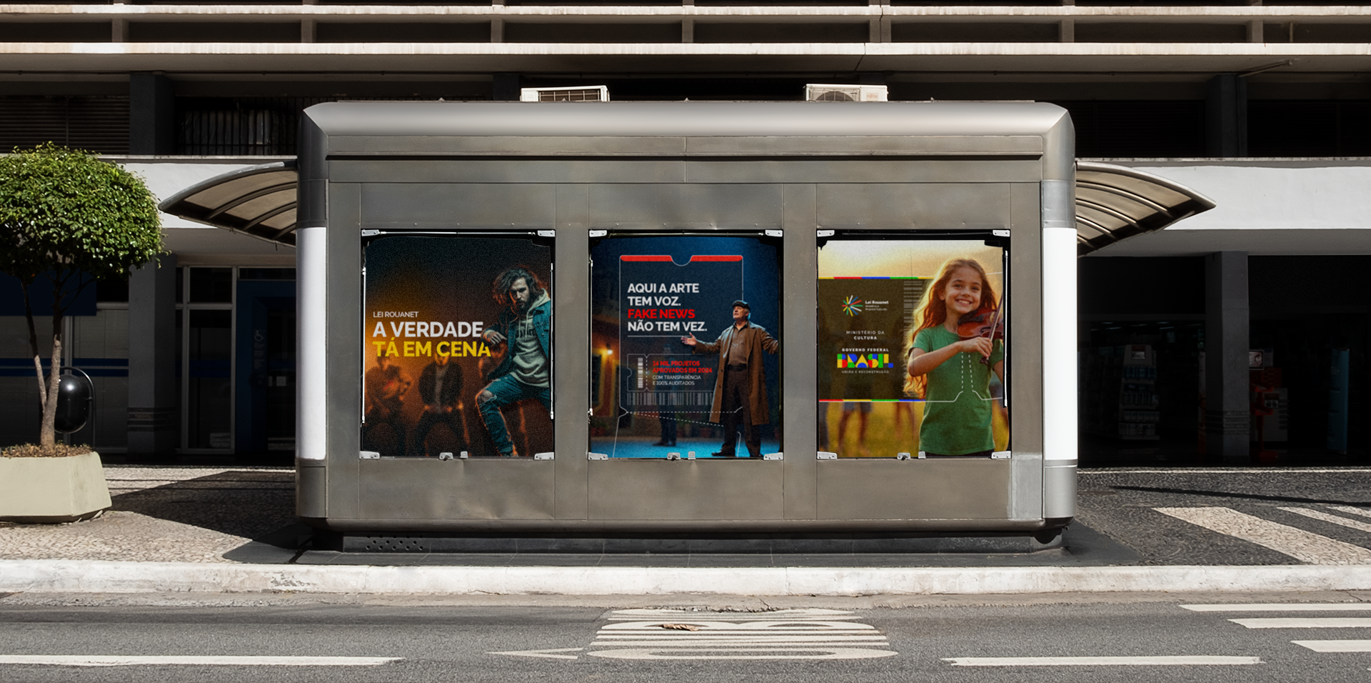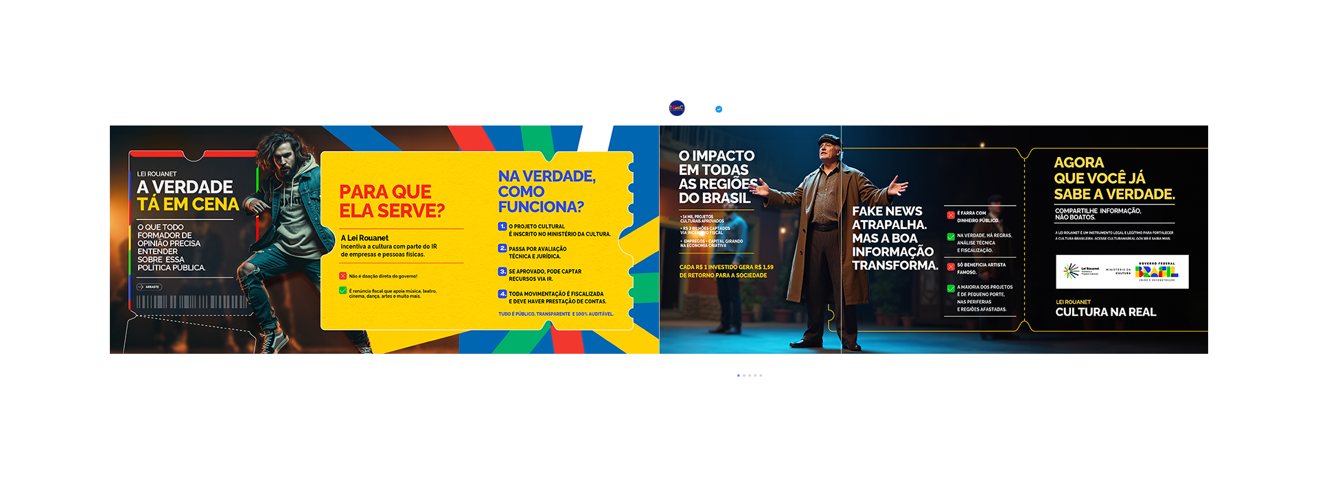 Ministério da Cultura — Governo Federal Brasil | Lei Rouanet — “A Verdade Tá em Cena” A campanha mostra o poder da arte e o impacto real da Lei Rouanet na sociedade, combatendo desinformação e fake news. Criamos um Key Visual forte e unificado, com cores vibrantes, tipografia marcante e composições que conectam música, dança e teatro, celebrando a diversidade artística brasileira. A narrativa combina dados reais com uma mensagem central: “Aqui a arte tem voz. Fake news não têm vez.” O resultado é uma comunicação clara, envolvente e visualmente impactante, que informa, emociona e reconecta o público com a importância da cultura no Brasil.