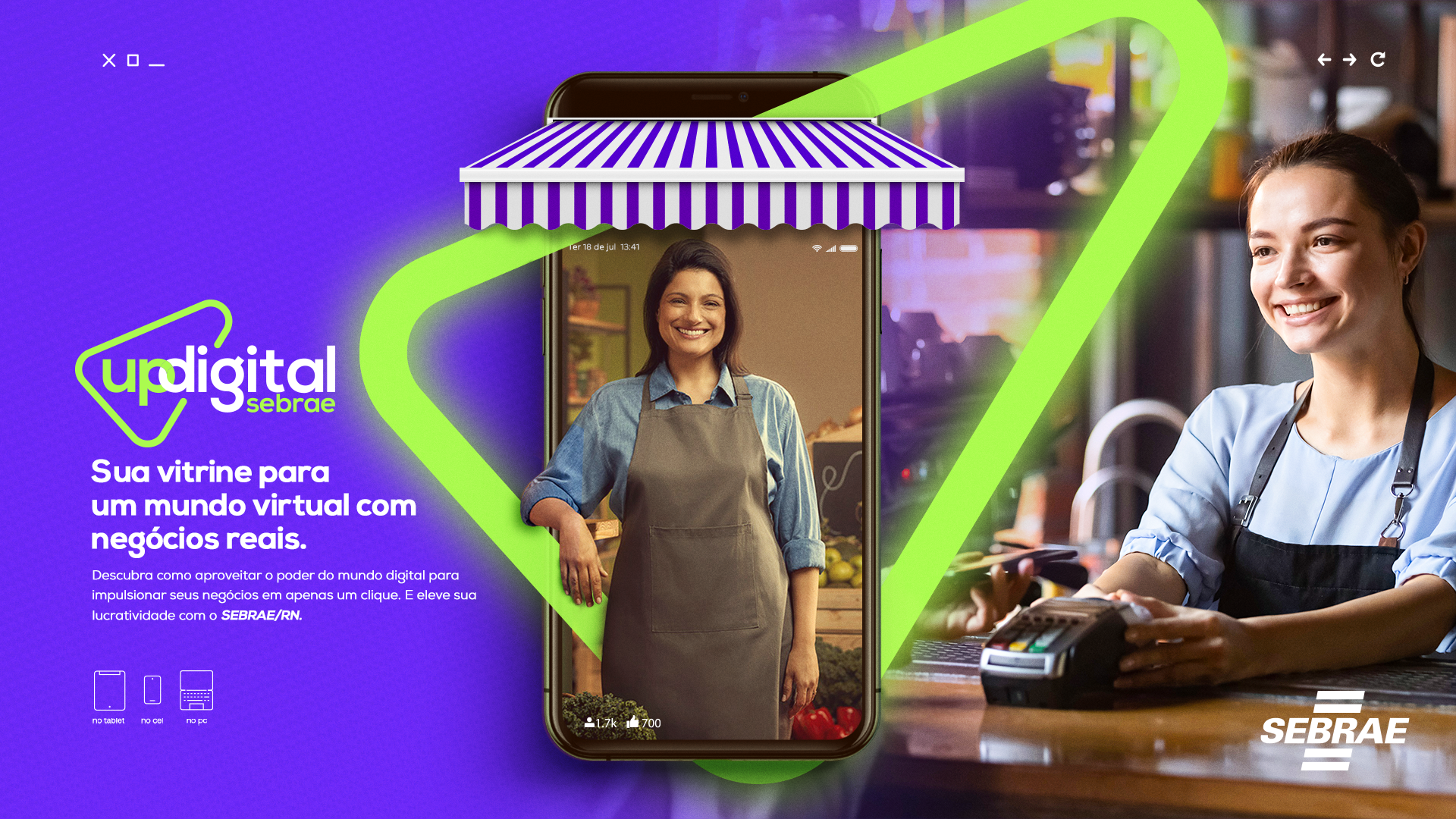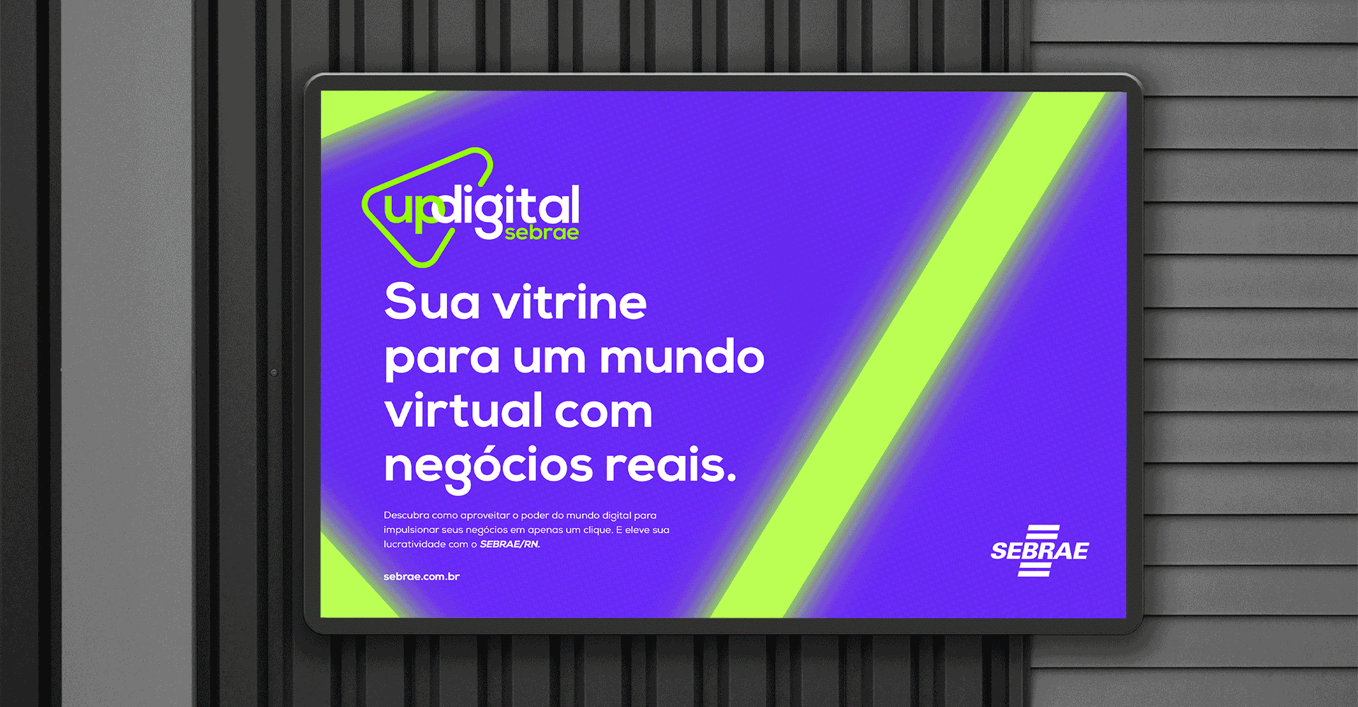 Sebrae/RN, desenvolveu uma comunicação onde oferece serviços ao micro empreendedor, através do meios digitais para gerar grandes resultados. Para transmitir toda sua gama de serviços e produtos foi criado uma comunicação jovem e abragente, com uma linguagem personalizada e exclusiva, além de grafismos visuais que representam design, movimento e tecnologia. Fizemos um redesign do produto Up Digital Sebrae, para uma proposta mais jovem e que pudesse falar com públicos mais jovens, e uma linguagem da comunicação vivida. Essa proposta foi uma concorrência para o produto de negócios com um formato que alcancem novos consumidores.
