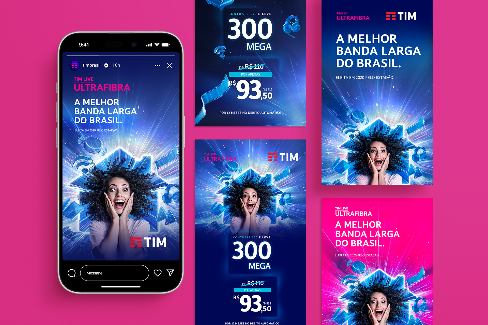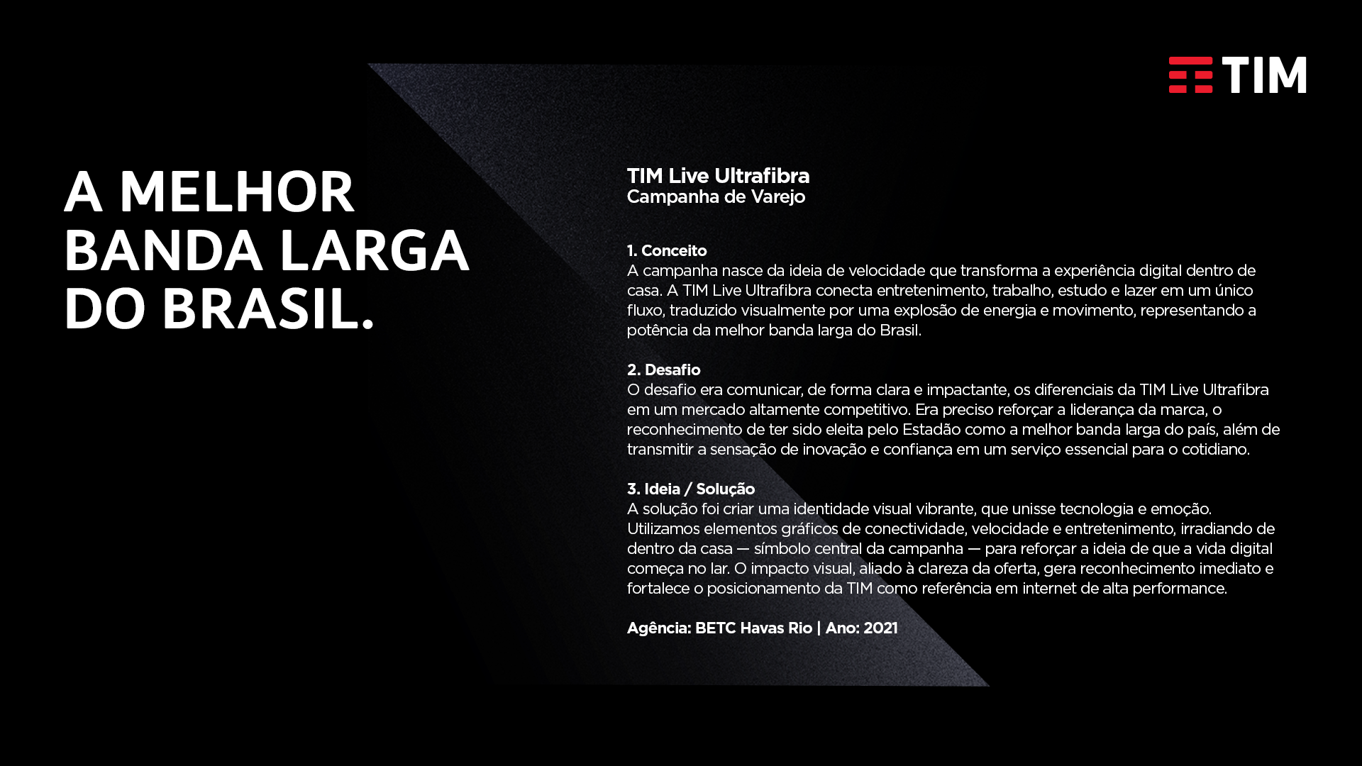 Campanha desenvolvida para a TIM Live Ultrafibra, destacando o conceito de velocidade e conectividade que transforma o dia a dia dentro de casa. O projeto trouxe como desafio comunicar de forma clara a liderança da marca em um mercado competitivo. A solução foi criar uma identidade visual vibrante e impactante, unindo emoção e tecnologia para reforçar a TIM como referência em internet de alta performance.